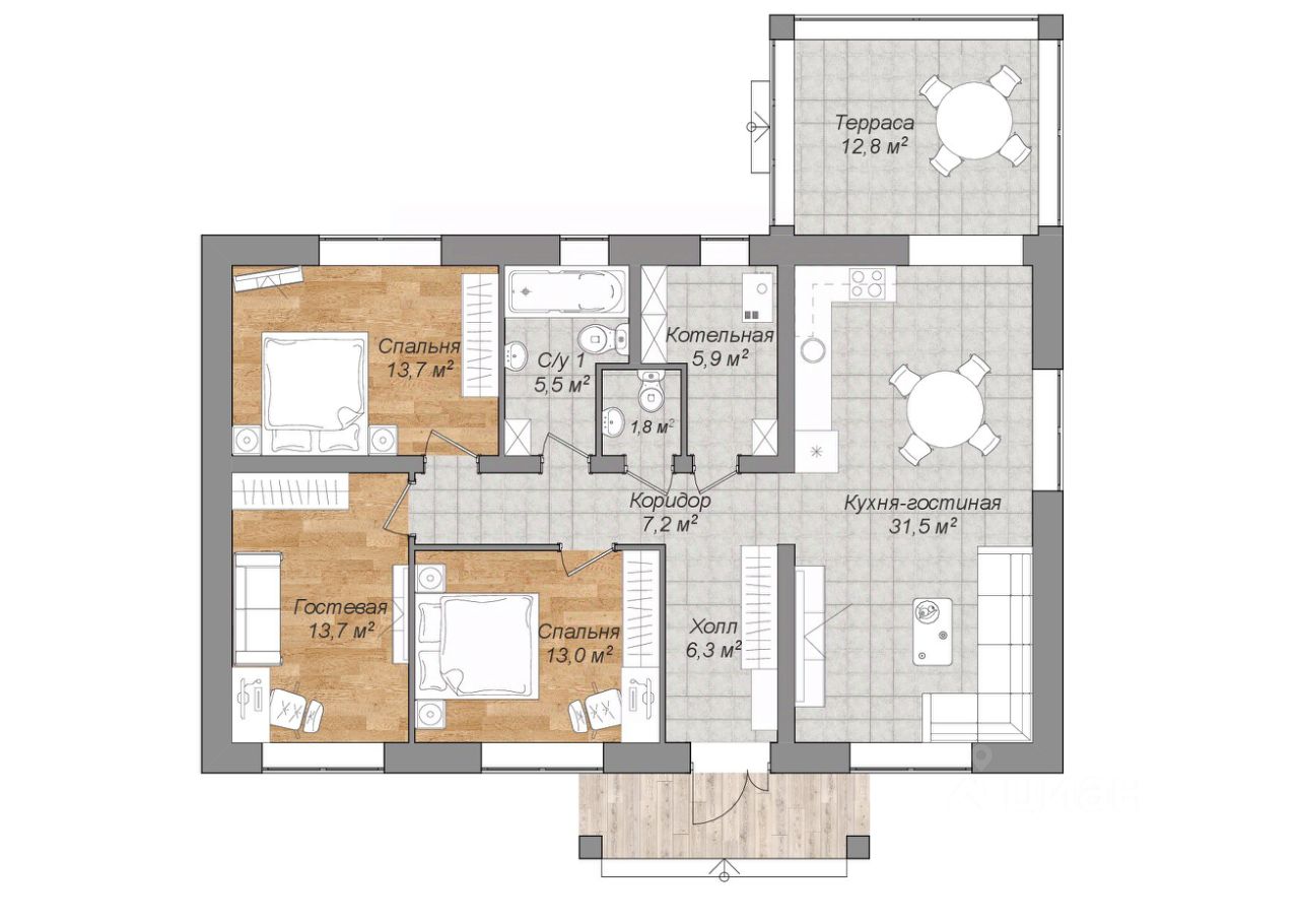 • Просторная кухня-гостиная для семейных вечеров,