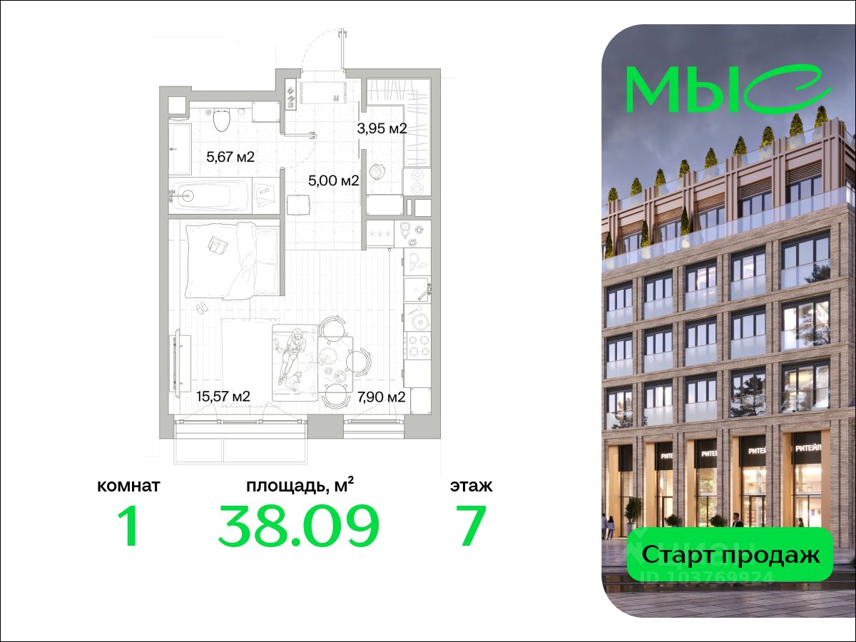 В продаже квартира площадью 38.09 кв. м без отделки на 7 этаже 8 этажного дома. Квартира находится в премиальном жилом комплексе ''МЫС'' (Застройщик - MR Group).