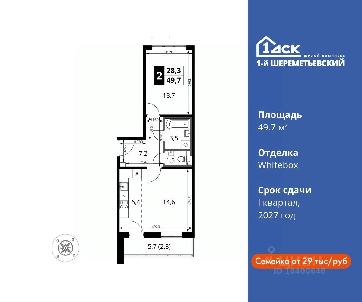Максимальные скидки при 100% оплате. Прямая продажа от застройщика! Жилой Комплекс класса Комфорт плюс. Продаётся 2-к квартира номер 815 общей площадью 49.7 кв.м на 8-м этаже 16 этажного дома. Отделка Whitebox.
