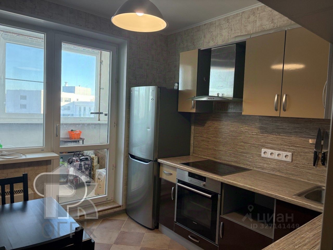 Просторная кухня в 9 кв. м уже оборудована мебелью, а остекленный балкон служит удобным дополнительным пространством.